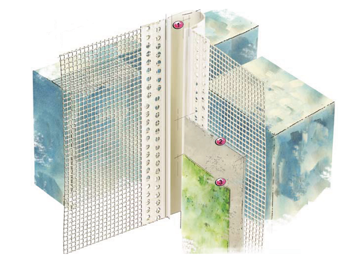 По обеим сторонам основы профиля предусмотрена устойчивая к агрессивным средам стеклосетка, которая в процессе монтажа полностью утапливается в армирующем слое шва и соединяется с полотном фасадной сетки. Важно производить монтаж таким образом, чтобы выступающая средняя часть из мягкого ПВХ находилась сверху. При стыковке верхние профили укладываются на деформационный шов выступающей частью сетки вниз. Таким образом образуется нахлёст элементов друг на друга, что исключает попадание воды в область шва.